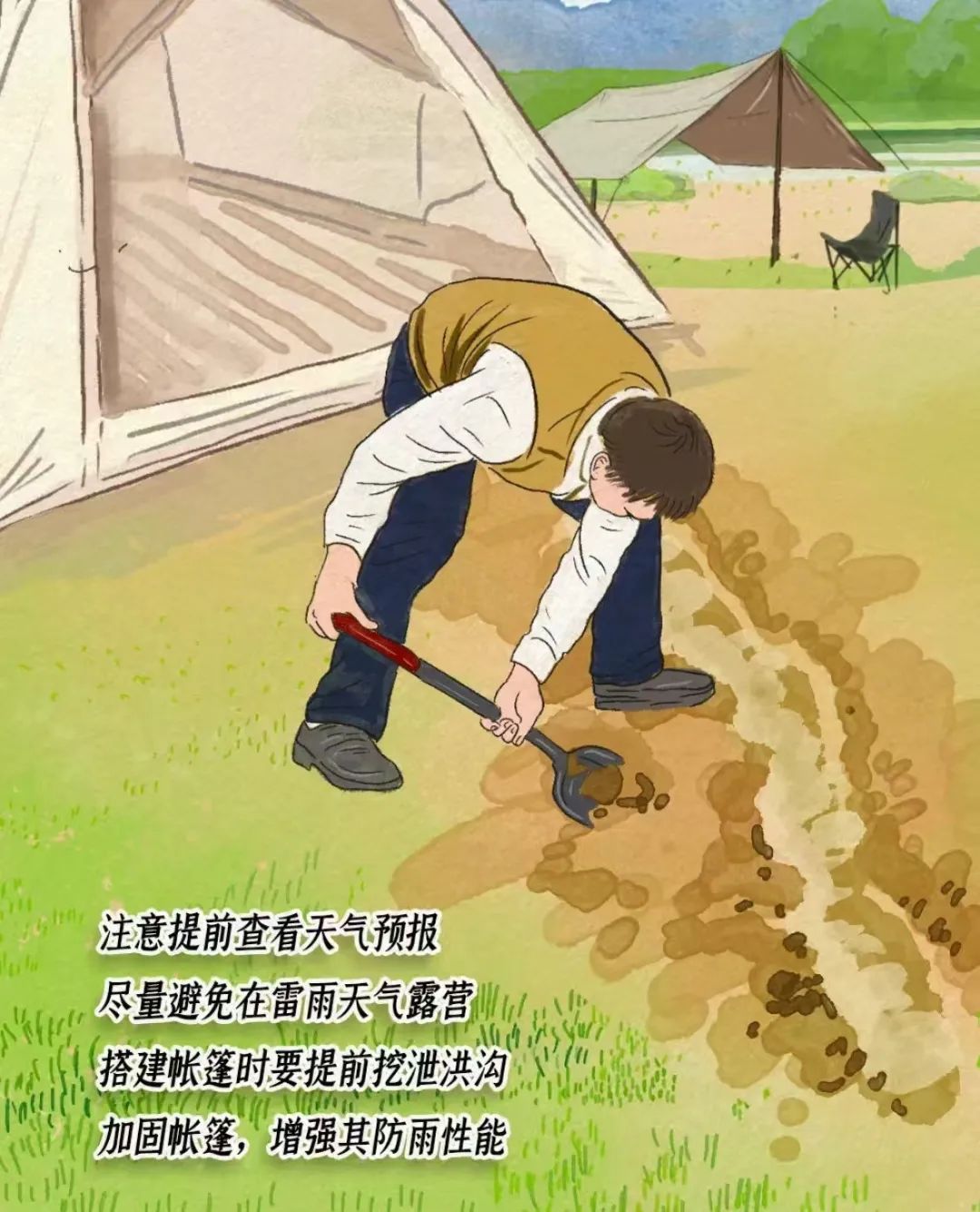 携带必要的露营安全装备,如防水袋、应急灯、急救包等。雨季露营,搭建帐篷时可提前挖泄洪沟。